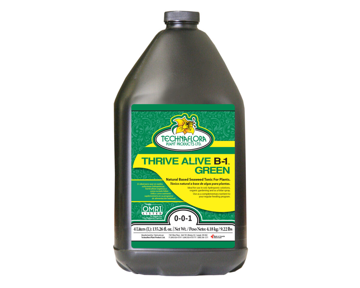 Thrive Alive B-1 Green™ es un tónico natural a base de algas marinas que es ideal para usar en suelos, soluciones hidropónicas o como rociado foliar. Registrado por el OMRI® (Instituto de Evaluación de Materiales Orgánicos), Thrive Alive B-1 Green™ es apto para usar en la horticultura orgánica. Thrive Alive B-1 Green™ puede aplicarse como nutriente suplementario en su programa de alimentación habitual.